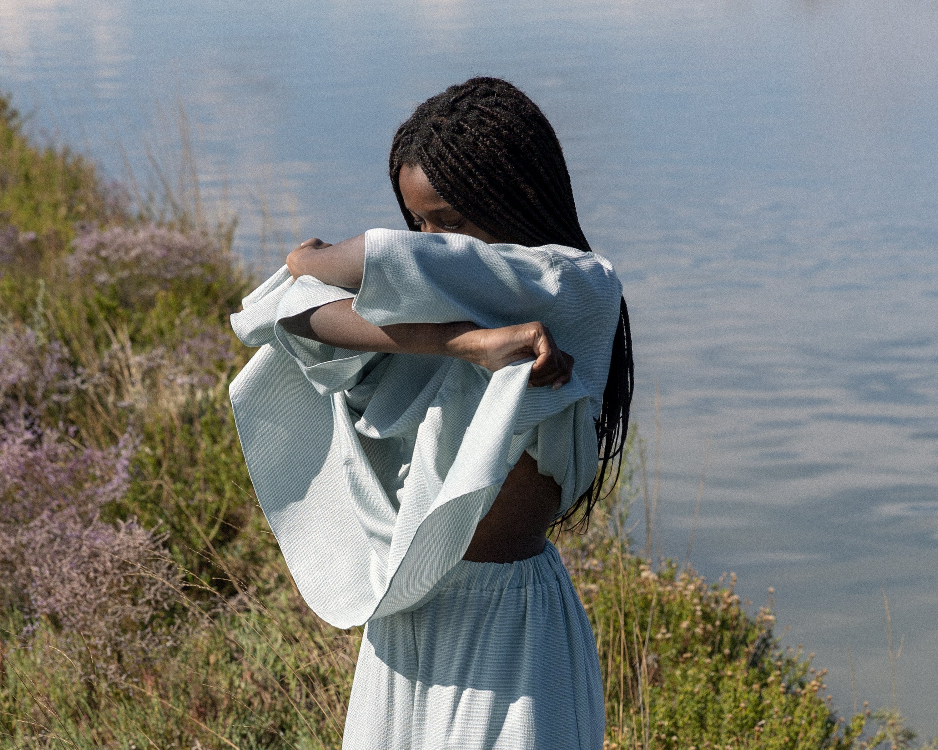 We believe that sustainability means harmony with nature, and that's why each of our garments is created slowly, with incredible attention to detail and in low production volumes. Our collection aims to be durable and timeless, able to adapt to size changes and passing trends.