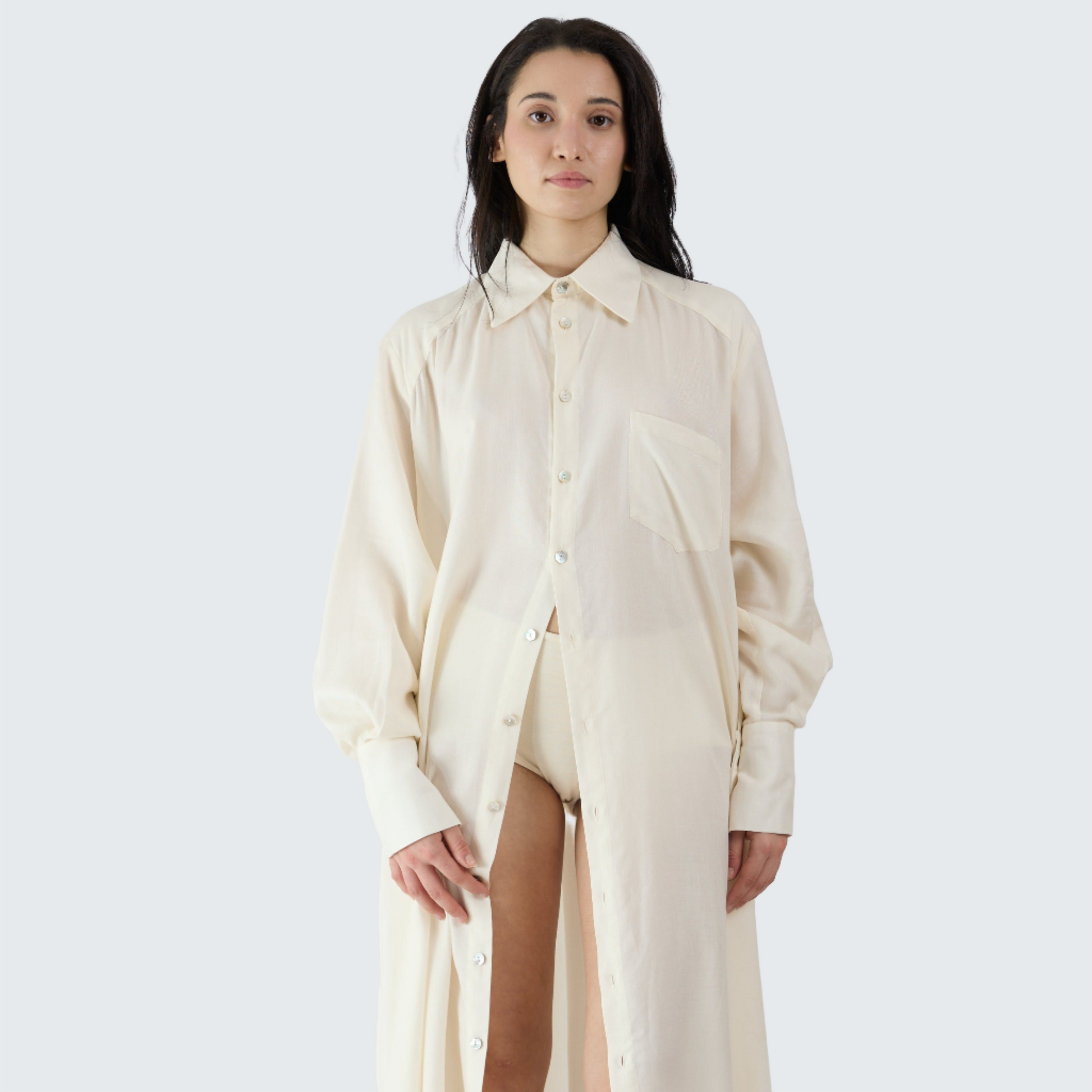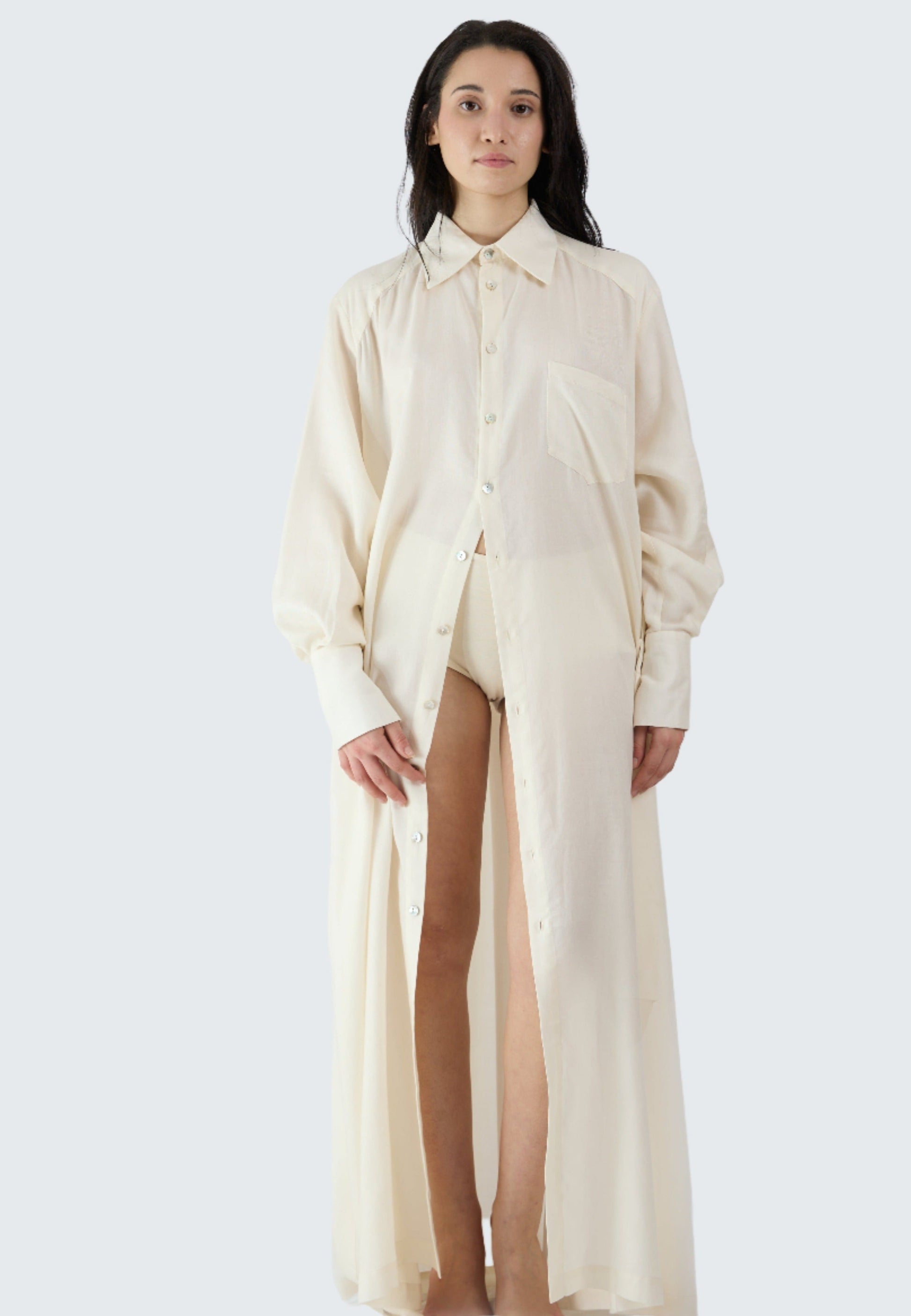 Antonietta è stato progettato per darti freschezza e comodità, senza rinunciare all’eleganza. Cercavamo qualcosa di raffinato ma che non facesse sentire scomodi o a disagio quando lo si indossa, come spesso accade con gli abiti più formali. Da qui, il nostro team di designer ha dato vita ad un abito camicia sartoriale unico nel suo genere, che ha l’essenza di una camicia da notte e la forma di un abito elegante. Realizzato al 100% con il nostro tessuto di alghe ed eucalipto, è pensato per essere versatile e adatto ad essere indossato sia di giorno che di notte. Che tu scelga di indossarlo direttamente a contatto con la pelle o sovrapposto ad altri capi, Antonietta ti farà sentire sicura di te e pronta ad affrontare qualsiasi evento con stile e naturalezza!
