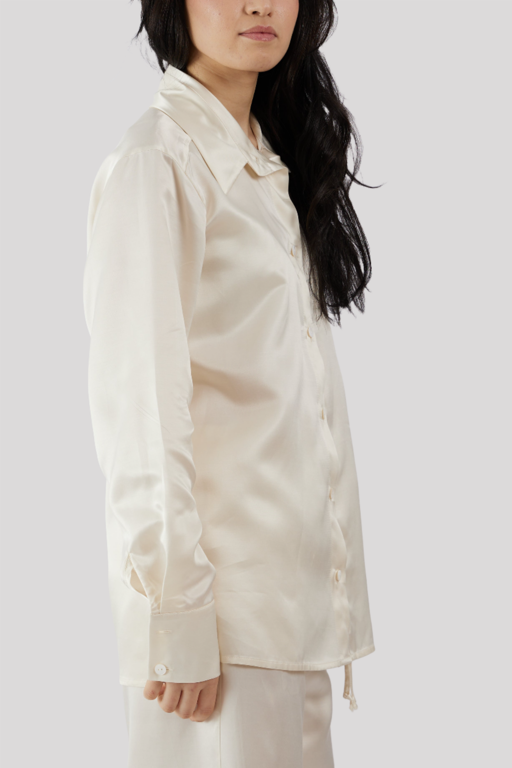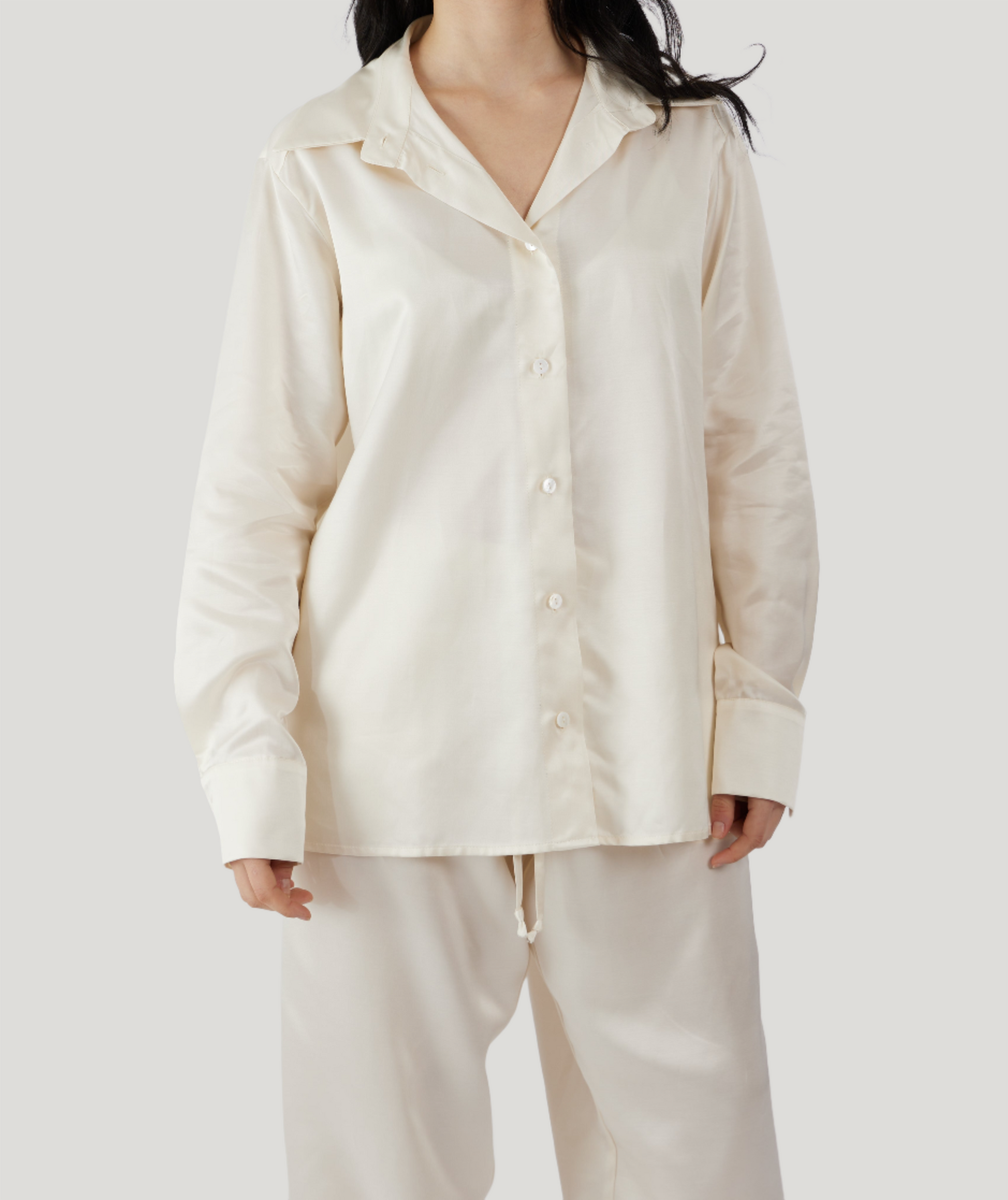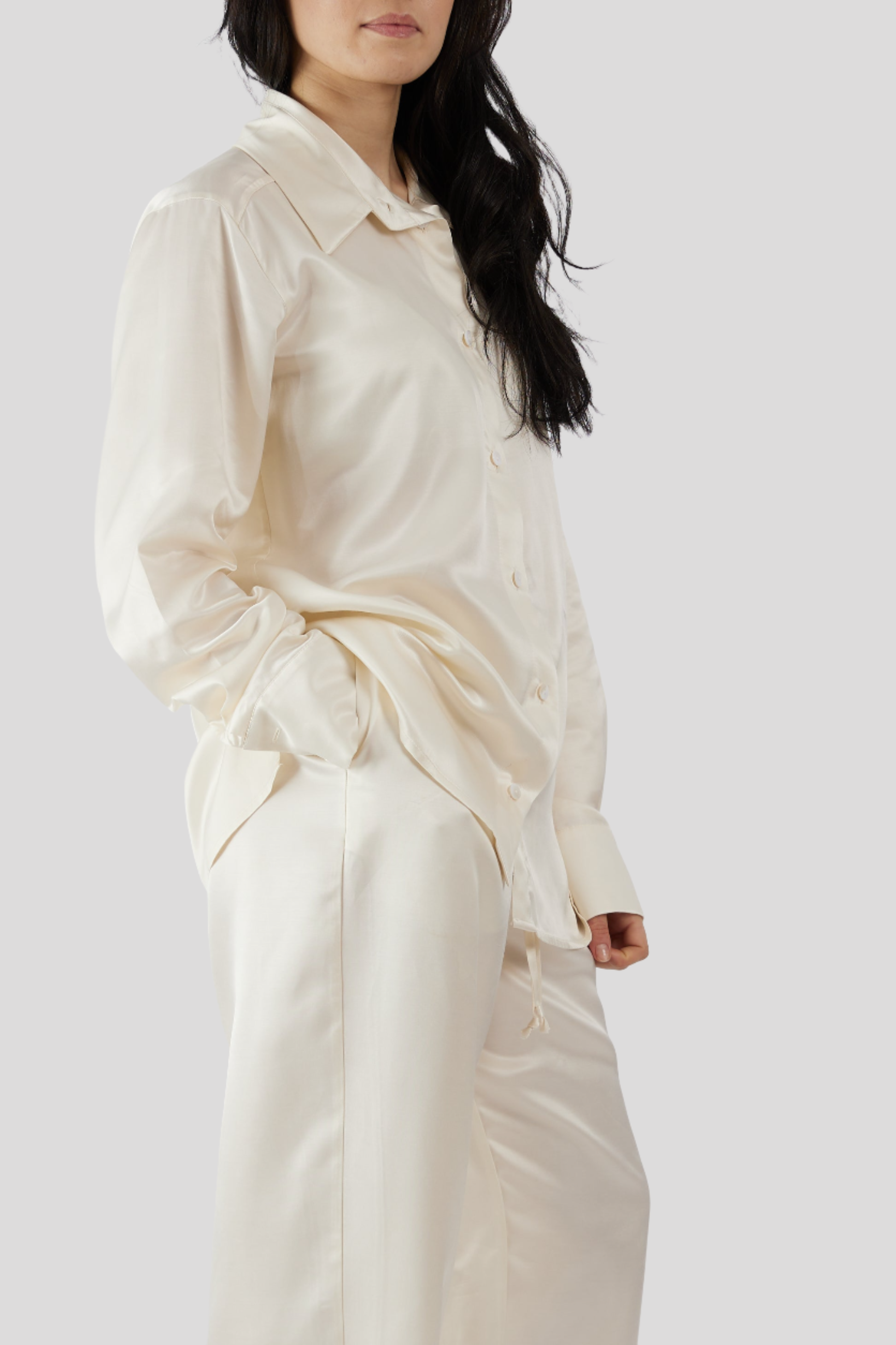 Elegante set pigiama da giorno e da notte in tessuto di cupro. Camicia con bottoni in madreperla, maniche con polsini e chiusura a bottoni. Pantaloni morbidi con coulisse. Il cupro, noto come seta vegetale, ha eccellenti qualità tattili sulla pelle e possiede proprietà antistatiche. Il pezzo indispensabile per costruire il vostro armadio di lusso sostenibile!