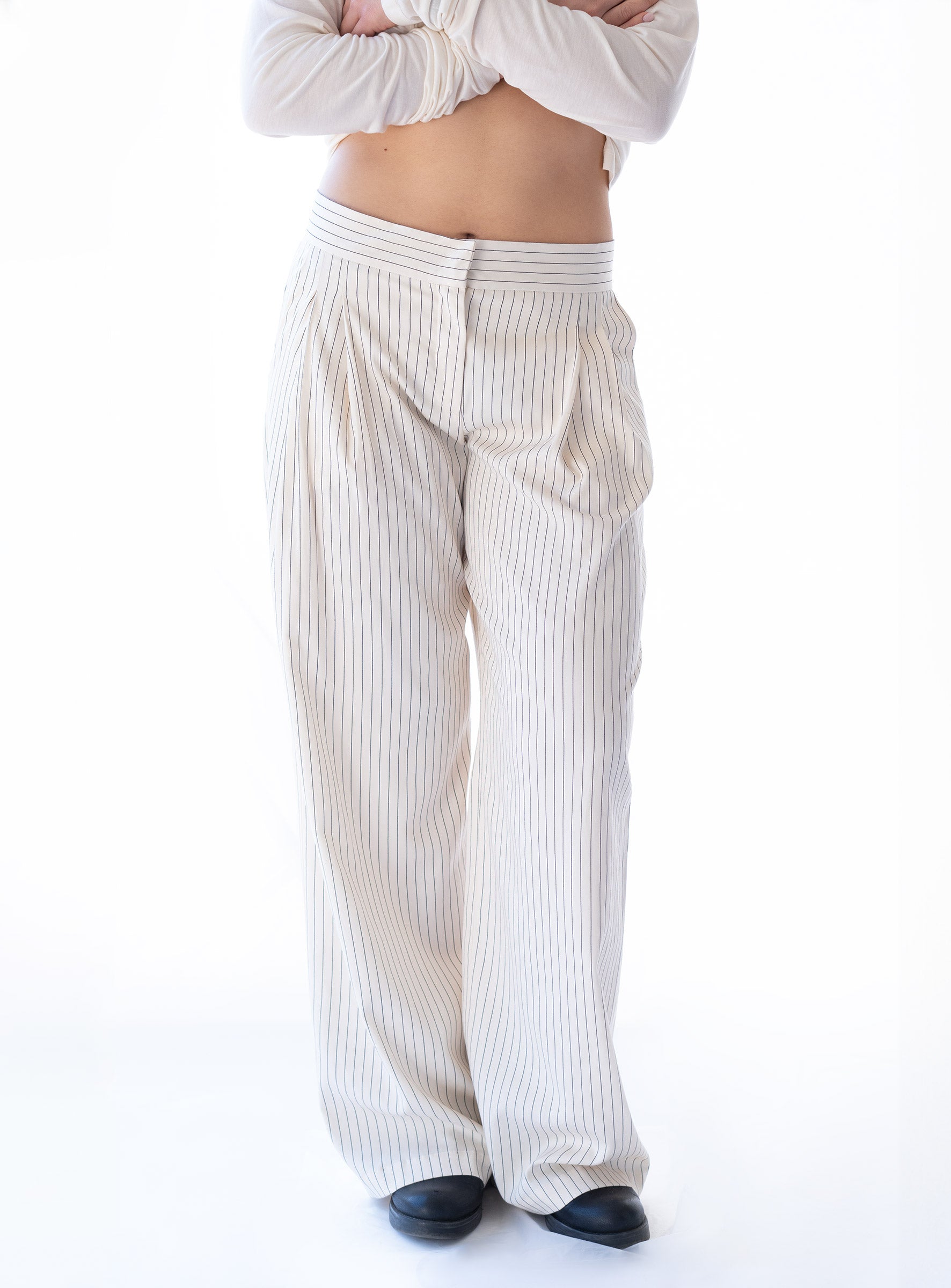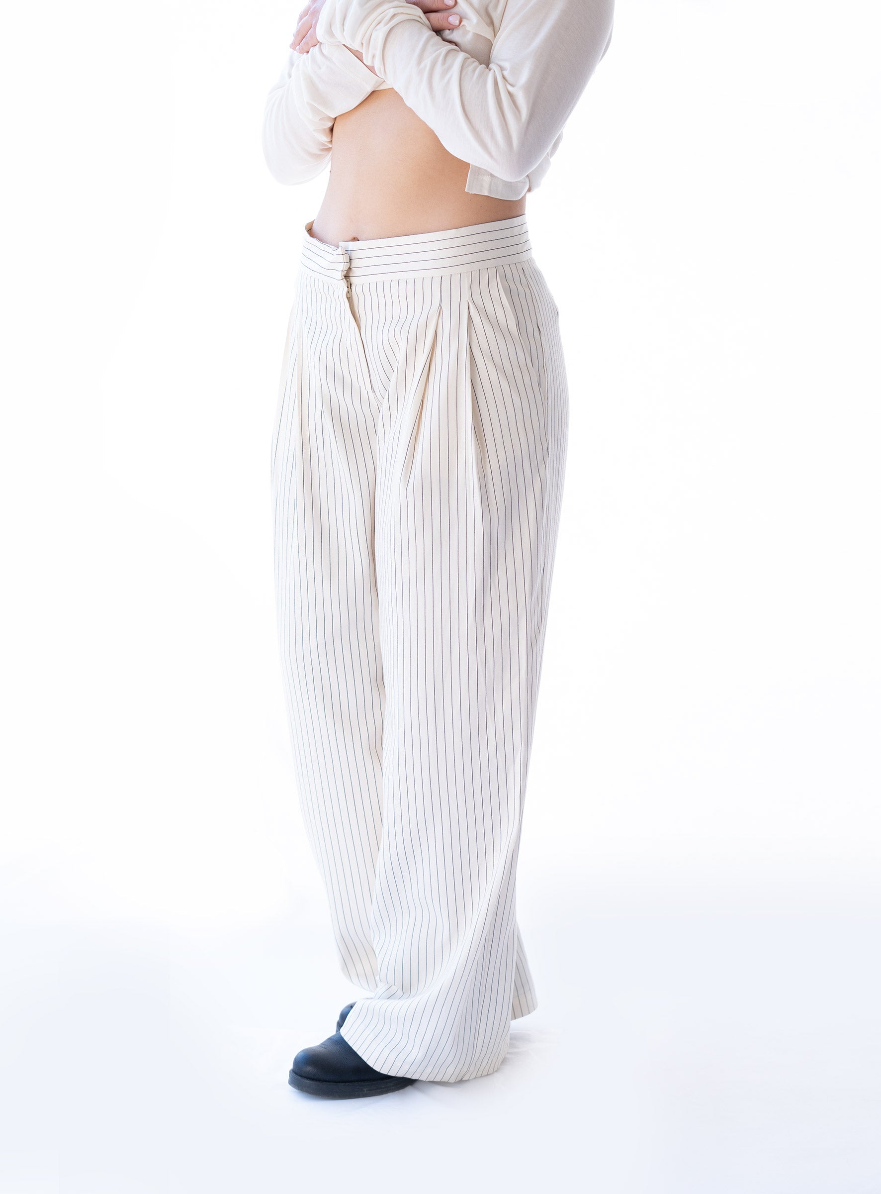 - Pantaloni: Vestibilità a gamba larga con doppie pieghe frontali, vita liscia con inserto elastico sul retro per un maggiore comfort, tasche laterali alla francese e dettaglio della tasca posteriore a filetto.