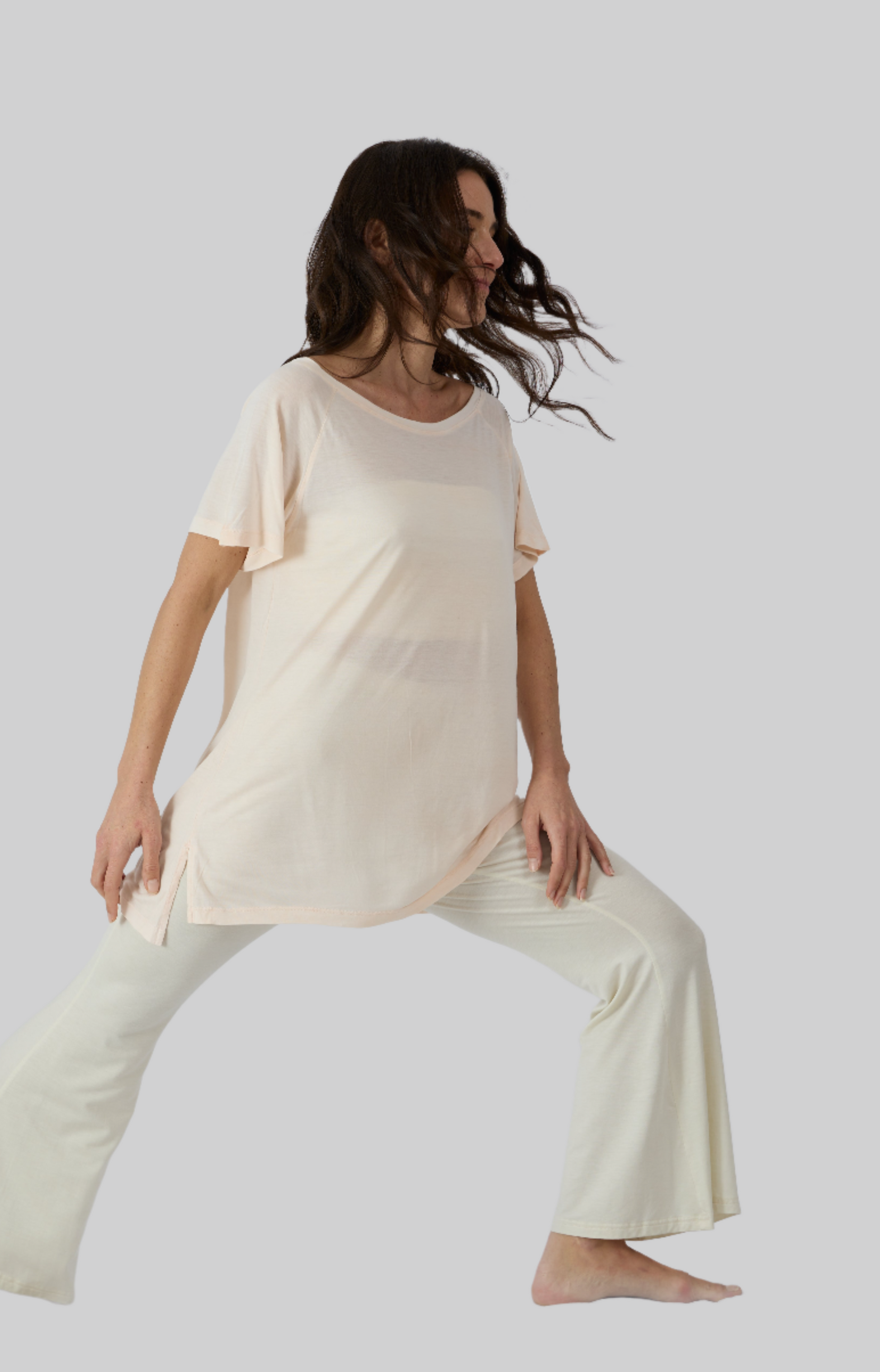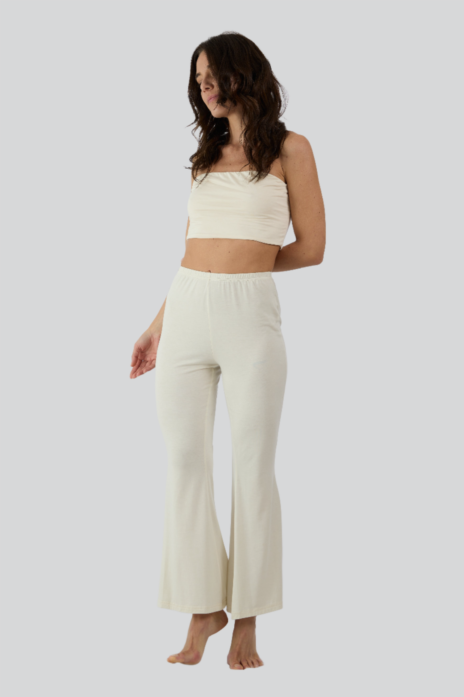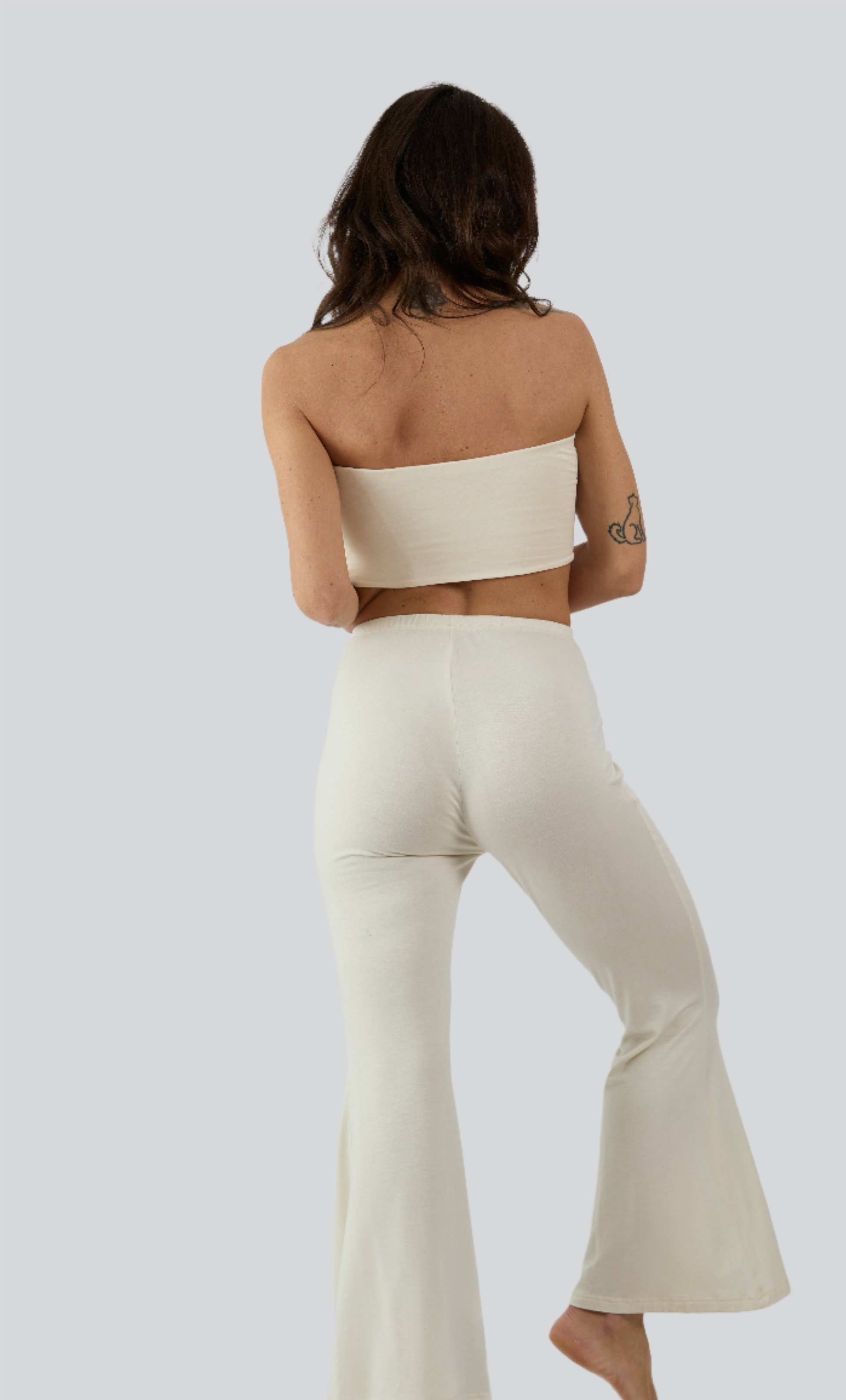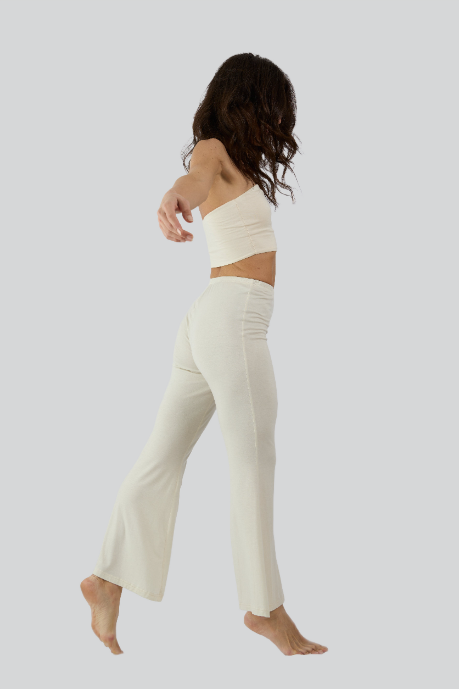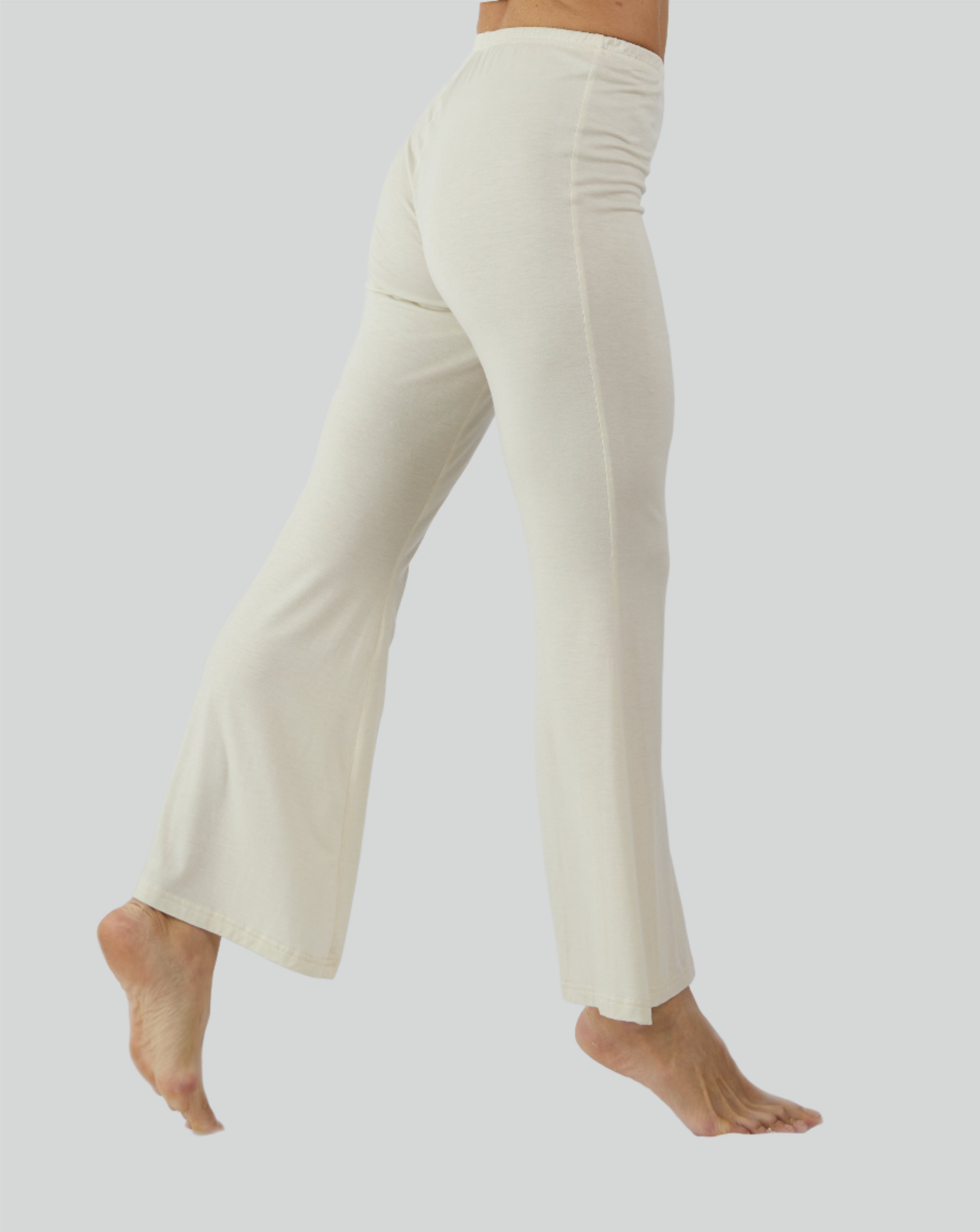 Realizzati in morbido jersey di alghe ed eucalipto, i nostri pantaloni sono pensati per lo yoga ma sono perfetti anche per chi cerca un'alternativa comoda ed ecologica ai jeans. Grazie al loro taglio svasato, si adattano a tutte le forme e altezze, offrendo stile senza sacrificare il comfort.
