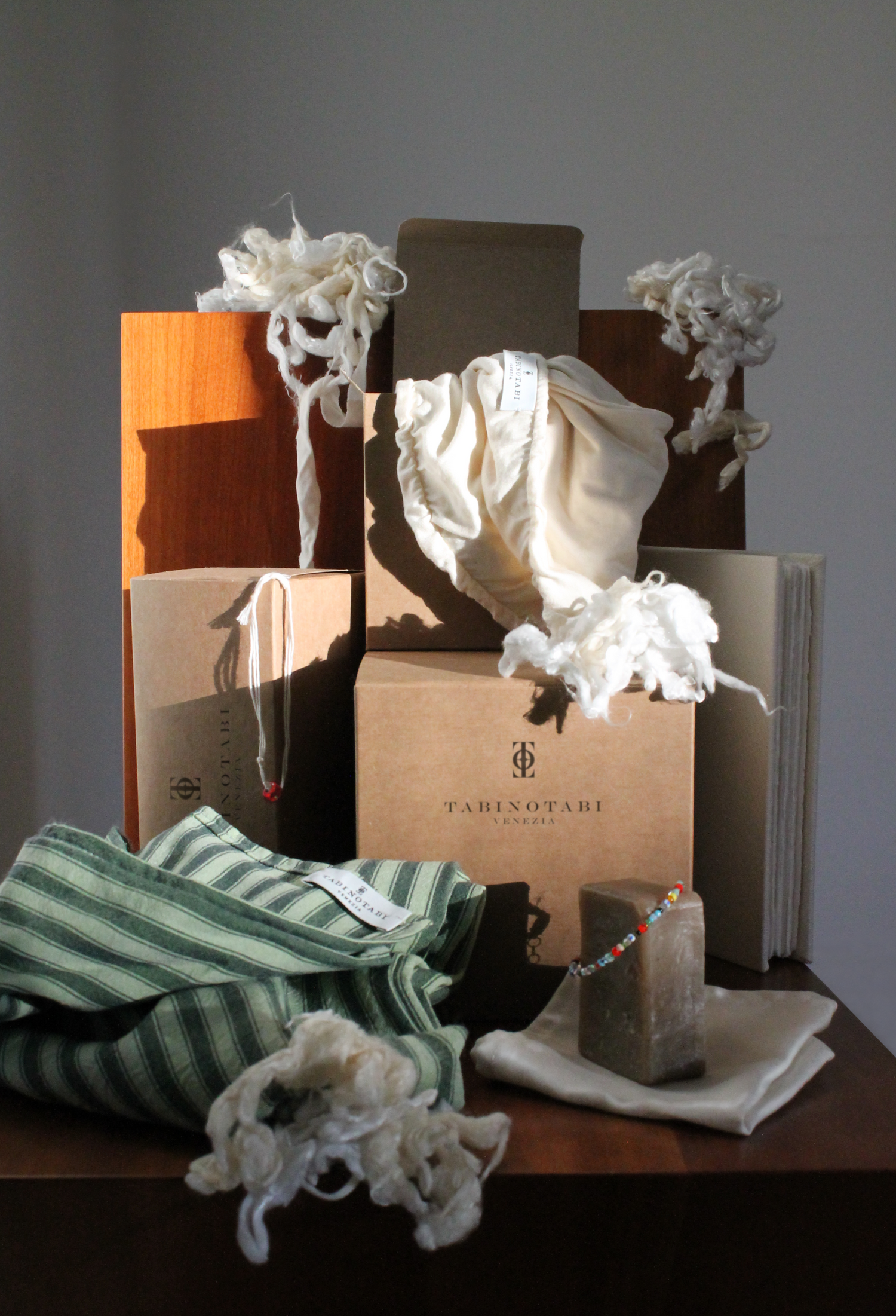 Tabinotabi uses only 100% natural, eco-friendly, and skin-friendly fabrics. Some of our fibers, for example, are derived from bananas, mint, or algae, such as the Seacell fabric: a blend of algae and eucalyptus, with anti-inflammatory, decongestant, and toning properties.